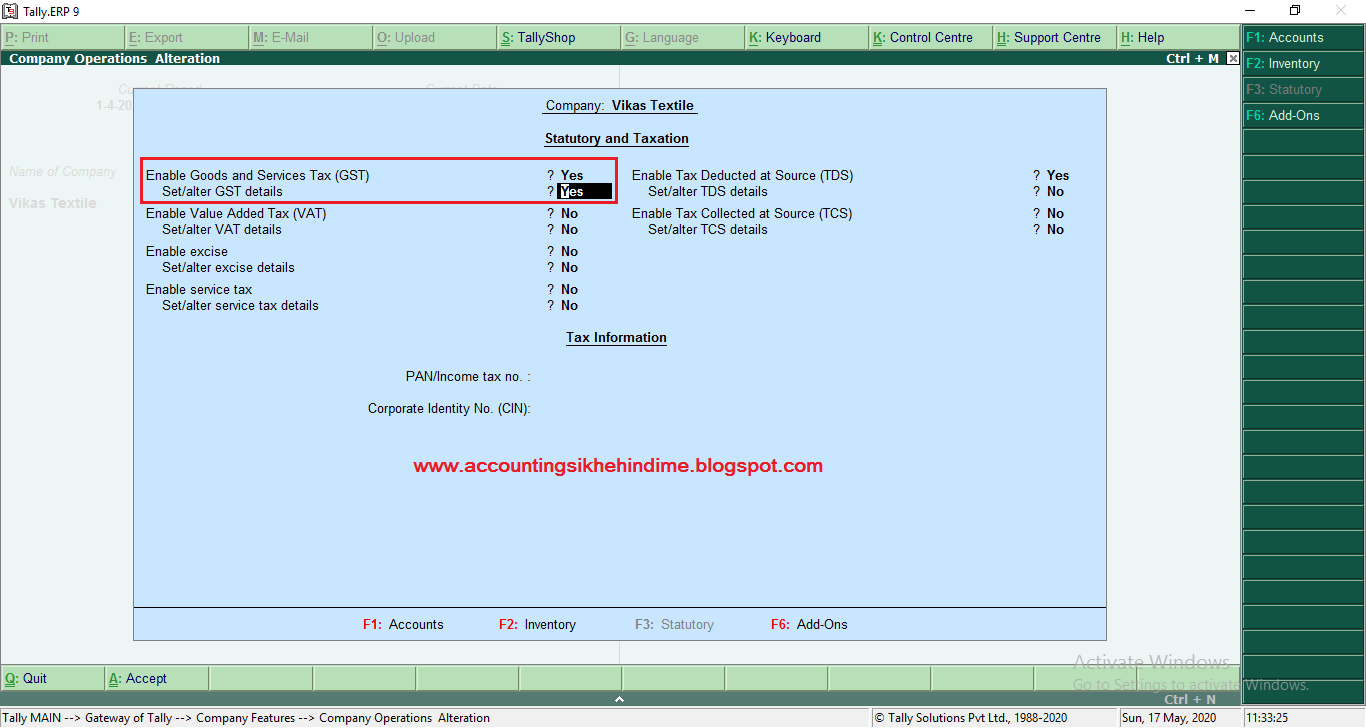 Step 5 :- Statutory & Taxation options पर Enter करने के पश्चात्‌ हमारे सामने चित्र अनुसार एक और Statutory & Taxation की विंडो open होगी। इस विंडो के ऊपर उस company का नाम होता है। जिसमें हमे GST Enable करना है।