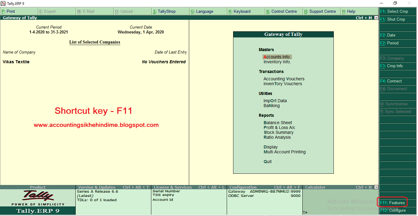 Step 2 :- अब हम Gateway of Tally की विंडो पर F11 shortcut key प्रेस करेगे। या Gateway of Tally की विंडो के right side मे उपस्थित Features option पर click करेगे।