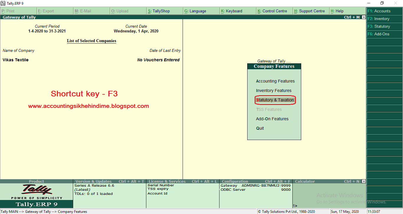 Step 4 :- अब हम इस Company Features की विंडो से Statutory & Taxation options पर Enter करेगें।