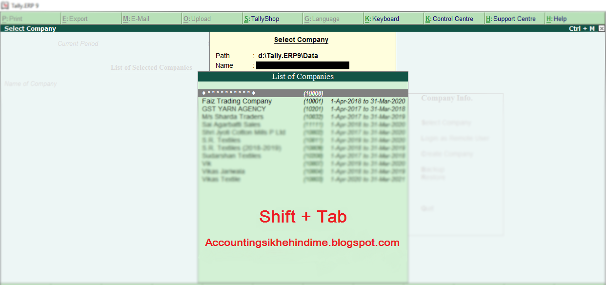 3. Select Company की विंडो पर हम Keybord से Backspace बटन प्रेस करेंगे। या Shift + Tab बटन प्रेस करेंगे। और Path option पर आयगे।