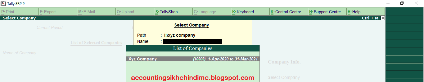 2. Company Info. की विंडो से हम Select Company ऑप्शन पर Enter करेंगे। अब हमारे सामने एक Select Company की विंडो Open होगी।