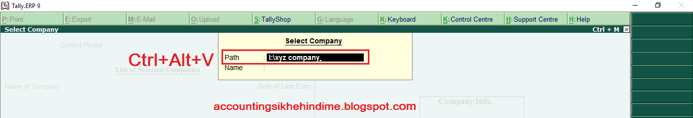 2. Select Company की विंडो पर हम Keyboard से Backspace बटन प्रेस करेंगे। या Shift + Tab बटन प्रेस करेंगे। और Path option पर आ जायगे।