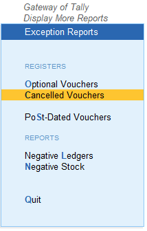 4. जिसके बाद हमे Cancelled Vouchers का ऑप्शन दिखाई देगा। उस पर Enter प्रैस करना है।